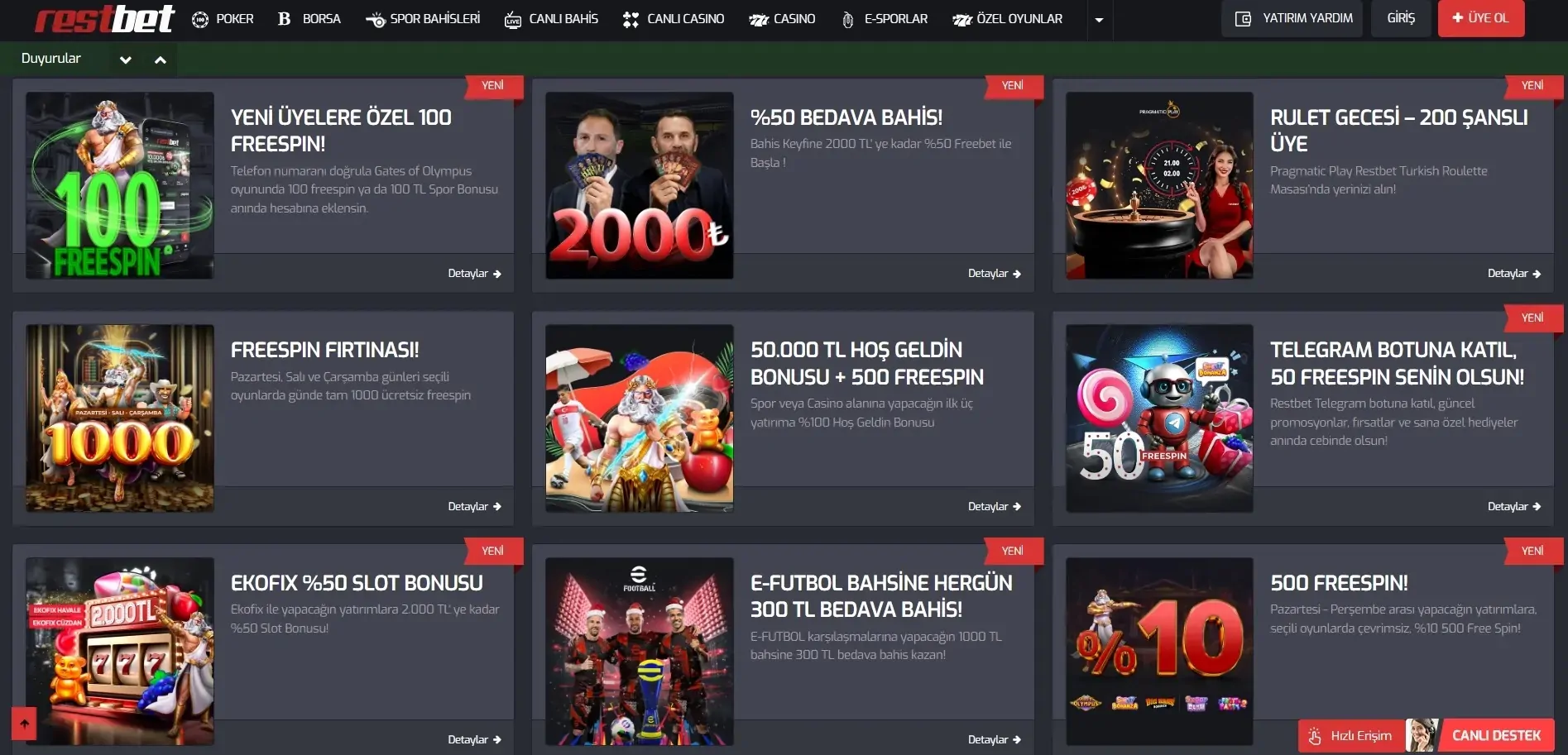 Peki, Restbet Nedir? Restbet, kullanıcılarına zengin bahis seçenekleri sunan kapsamlı bir oyun platformudur. Yüksek oranlar ve sade kullanım yapısıyla öne çıkar. Spor bahislerinin yanı sıra casino ve canlı oyun bölümleri de aktif olarak hizmet vermektedir.
